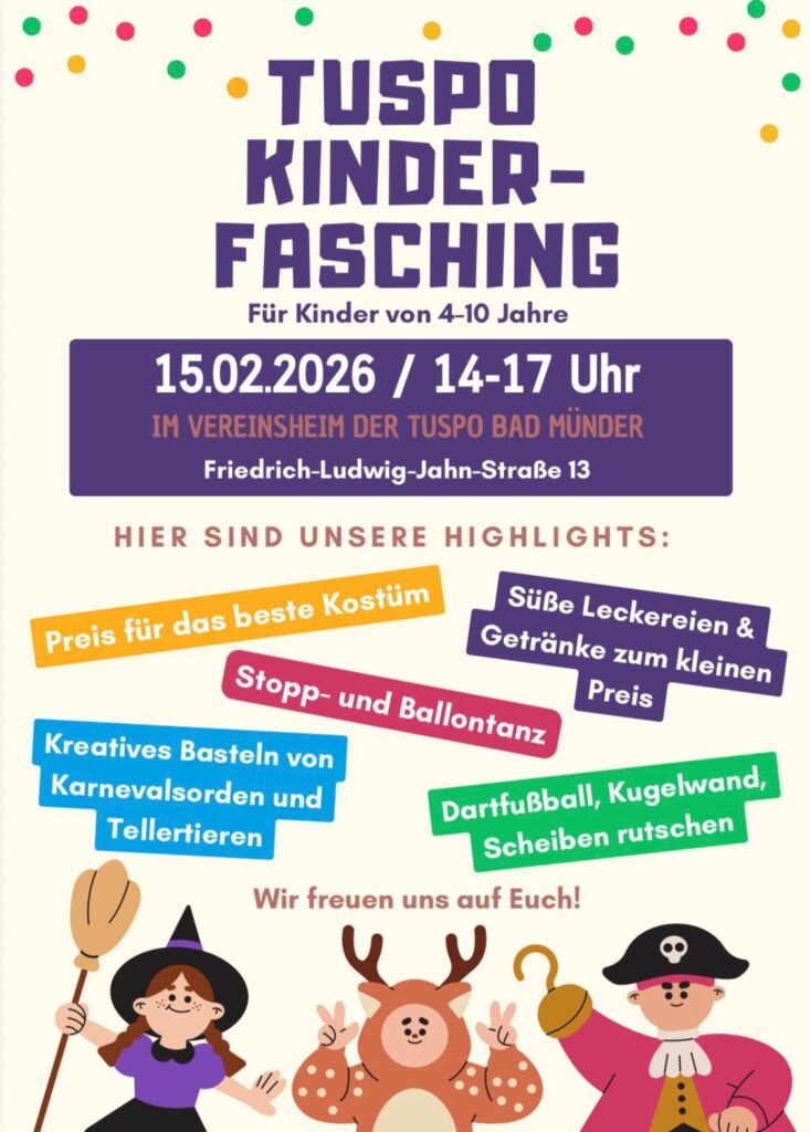 Die TUSPO lädt ein zum Kinder-Fasching ins Vereinsheim am 15.02.2026 von 14-17 Uhr! Für Kinder…